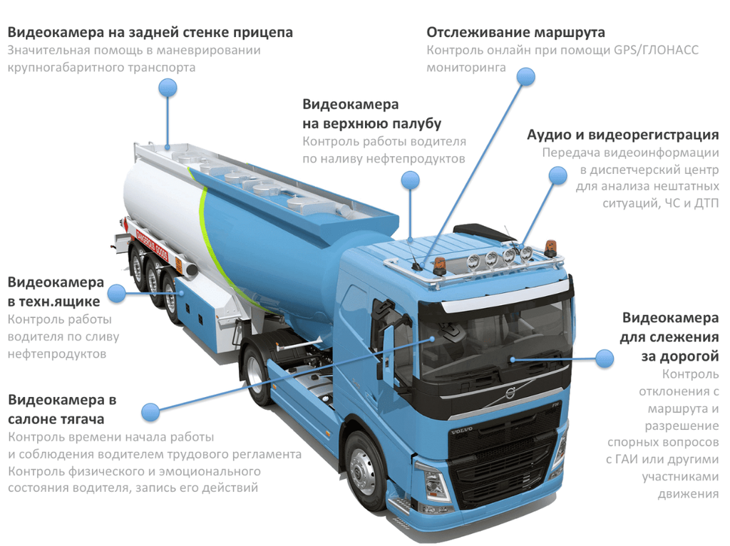 Причины установки видеонаблюдения на грузовом транспорте такие же, как и для установки на пассажирском транспорте. В комплексе ГЛОНАСС и видеонаблюдение решают проблему слива топлива и воровство со стороны водителя. Контролируется мастерство вождения, простой машины, решения выхода из аварийных ситуаций, и исключаются неправомерные выплаты соответствующим государственным органам. Перевозка грузов подразумевает проезд по мертвым зонам, это опасные участки, на которых необходим более детальный контроль движения для обеспечения безопасности. С помощью системы полностью отслеживается состояние груза.